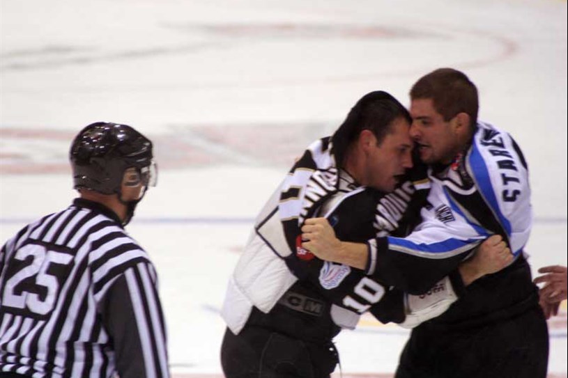 Frédéric Deschênes et David Guerrera se sont livré un bon duel de gardiens. En première période aucune des équipes n’est parvenue à enfiler l’aiguille. Chacun des portiers a eu à se démarquer. Guerrera a frustré Dany Roussin alors que Deschênes a volé Francis Charette. Le premier combat de la soirée a opposé David Starenky face à Louis-Philippe Charbonneau.