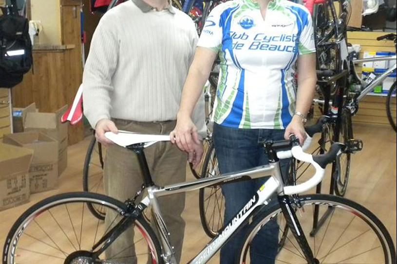 Le 23 mars dernier, Daniel Drouin, président du Club sur 2 roues Beauce, a remis l’un de ses huit vélos à la présidente du Club Cycliste de Beauce, Suzie Roy. Il s’agit d’un vélo Rocky Mountain Oxygen 50 AC d’une valeur de 1900 $ dans le but d’encourager les jeunes à la pratique du vélo de route. Cinq autres sont fournis par le Groupe Procycle.