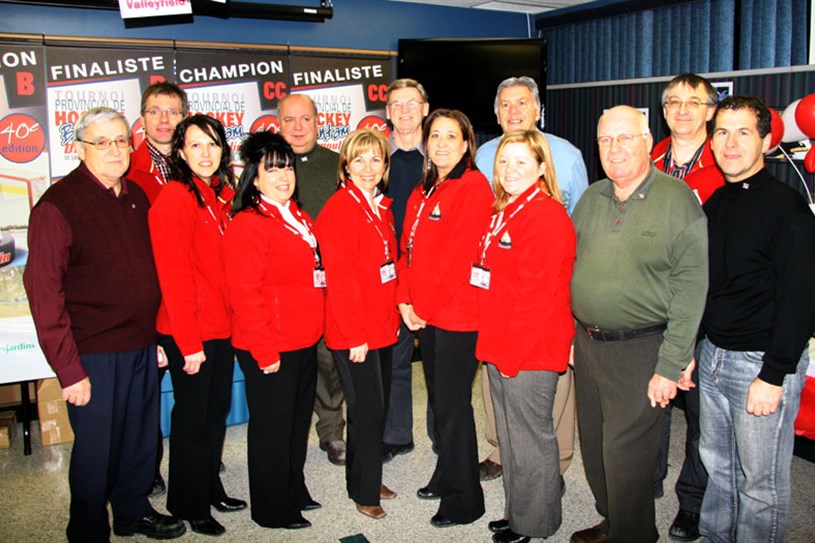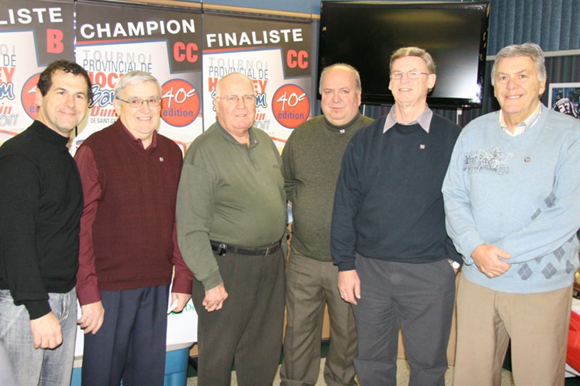 Le 40e Tournoi provincial bantam Dumoulin s’est mis en branle hier soir au Centre sportif Lacroix-Dutil. Les pionniers de la première heure de ce tournoi au fil des quatre dernières décennies ont été honorés au centre de la patinoire dans le cadre de la mise au jeu officielle. Parmi ceux-ci sont Michel Longchamps, Mario Marchand, Jean-Eudes Ruest, Nicol Larochelle, Robert Thibaudeau et Daniel Drouin représentaient les fondateurs Optimistes de ce tournoi ainsi qu’Hélène Tanguay représentant l’Ambulance Saint-Jean.