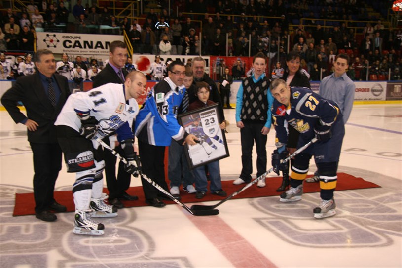 Avant la rencontre, l’organisation du Cool-Fm a honoré le plus prolifique défenseur de l’histoire de sa concession, Steve Gosselin. Il a donc vu son chandail rejoindre les hautes sphères du Centre sportif Lacroix-Dutil aux côtés de ceux de Mario Roberge, de Francis Lapointe et de Jonathan Delisle. L’ancien défenseur a eu droit à des applaudissements à tout rompre des 2144 spectateurs et de ses anciens coéquipiers.