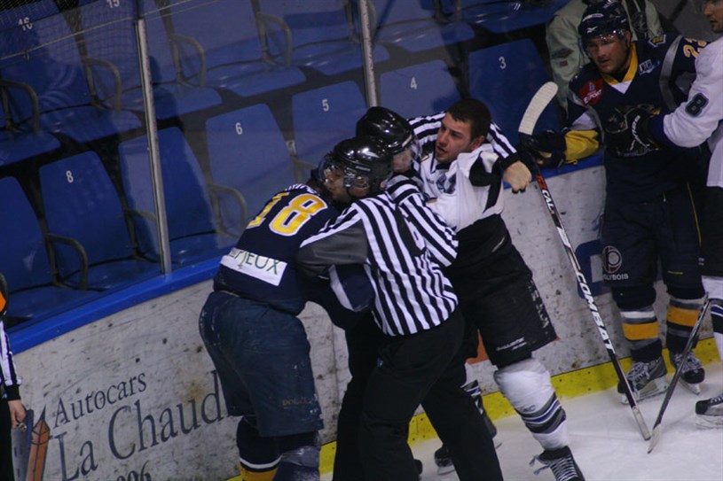 Les durs à cuire sont constamment sur la glace en fin de rencontre. Samuel Duplain s’est rué sur Hubert Poulin, puis les deux pugilistes ont engagé le dernier combat de la soirée.