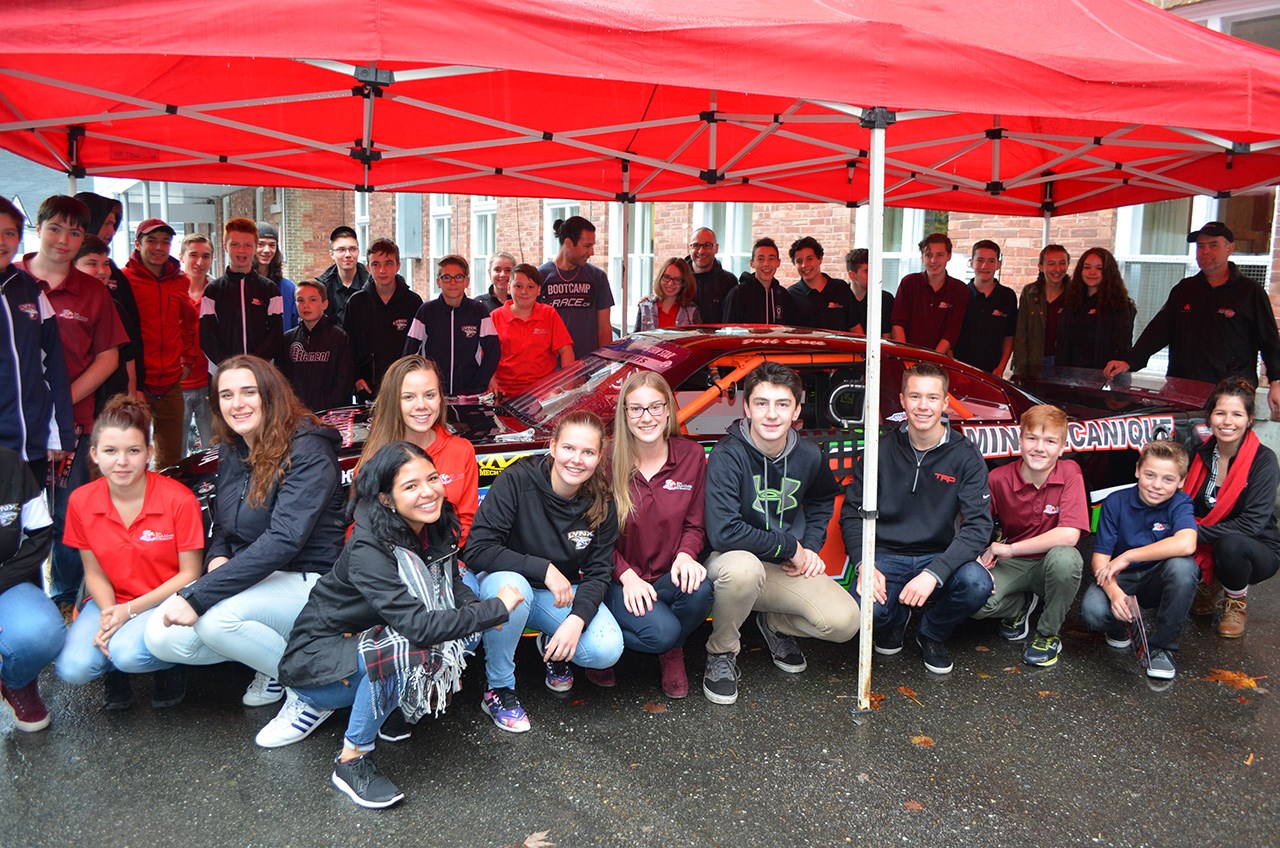 Pendant environ une heure à midi, le pilote Raphaël Lessard a signé des autographes en plus de parler aux jeunes de l’École Jésus-Marie de Beauceville, qui voulaient en savoir plus sur le monde de la course automobile.