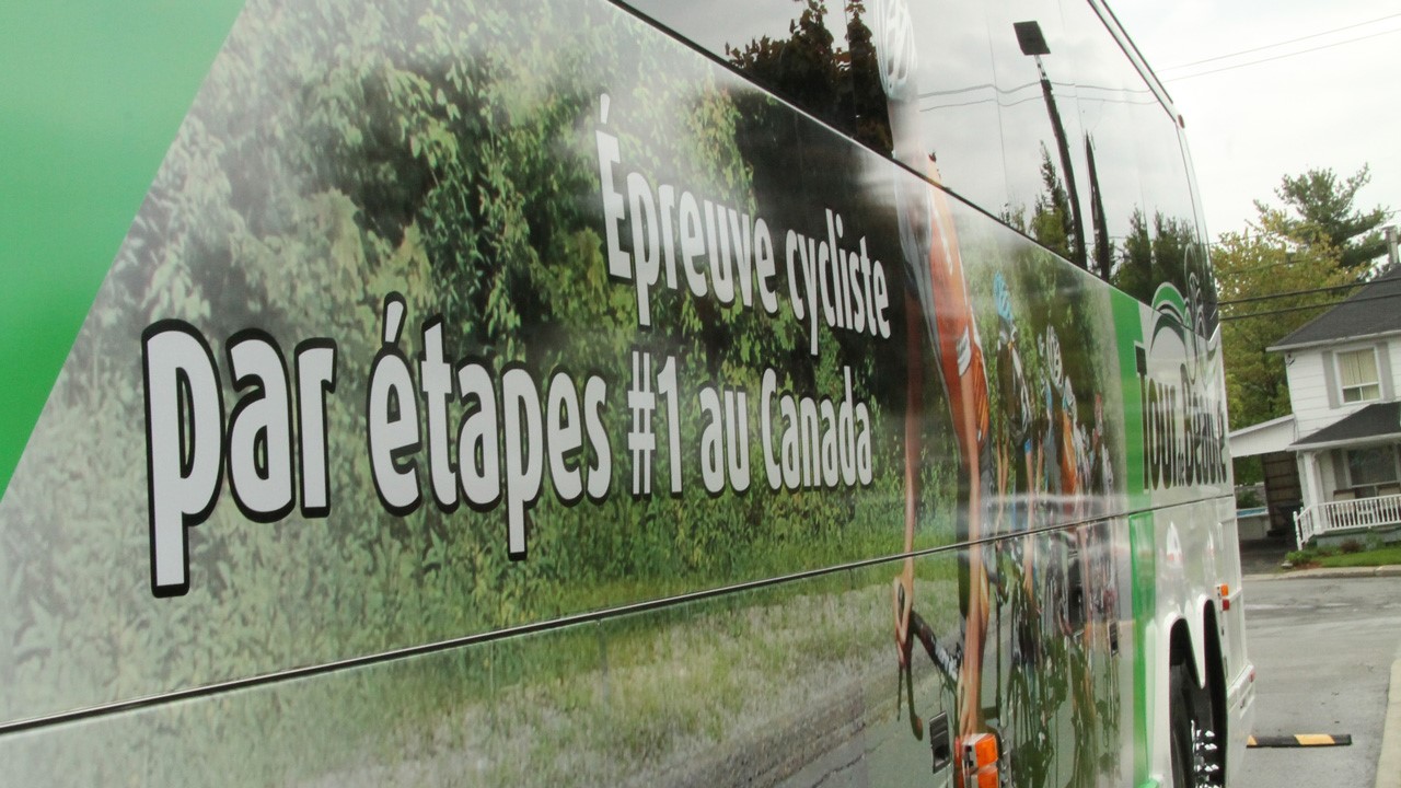 Un véhicule de l’entreprise Autocar La Chaudière est à l'effigie du Tour de Beauce grâce à la participation de Turbo Image.