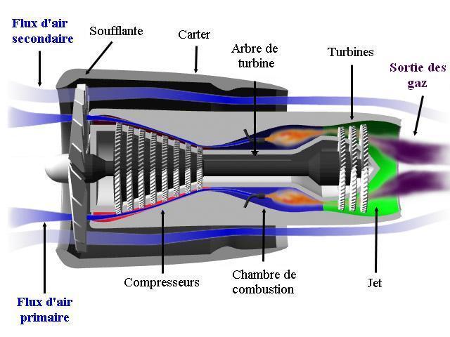 On voit ici un moteur en vue transversale. Vous voyez la grosse soufflante (fan) qui dirige l’air à deux endroits bien précis. Une partie de l’air est évacuée directement en arrière pour une poussée directe, et une seconde partie prend la direction des compresseurs. L’air est à ce moment compressée pour arriver dans la chambre de combustion pour y rencontrer le carburant ce qui génère alors une explosion continue, ce qui pousse encore plus l’air vers l’arrière, en entrainant avec elle les turbines qui elles actionnent les compresseurs et la soufflante en avant. Les gaz de sorties génèrent également une poussée mais beaucoup moins grande que l’air provenant directement de la soufflante qui génère près de 80 % de la poussée totale.