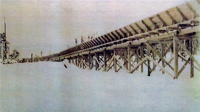 L'érection de cette imposante glissoire a duré plus d'un an. Il a fallu d'abord ériger un gros barrage à l'extrémité sud du lac Portage pour en augmenter la hauteur et constituer un immense réservoir en mesure d'accumuler des quantités énormes d'eau qui allait s'engouffrer avec force dans la glissoire en entrainant sans fin les billots coupés et rassemblés à la surface du lac. Supportée par des billots dont la hauteur atteignait parfois douze pieds, et bâtie avec de bons madriers, la glissoire, en forme de cuve, comportait une largeur de fond de 8 pieds et des appuis de côté de 4 pieds de hauteur. Elle serpentait pour contourner les montagnes et aller aboutir dans le lac Penobscot, où le bois était dravé et mené au moulin de Millinocket, situé à l'autre bout. Voyez les photos, ce fut un succès sur toute la ligne. Non seulement Édouard s'est-il mérité le respect de ses partenaires, mais il a aussi dépassé les quantités de bois prévues et réalisé des profits substantiels. Un exploit extraordinaire encore une fois.