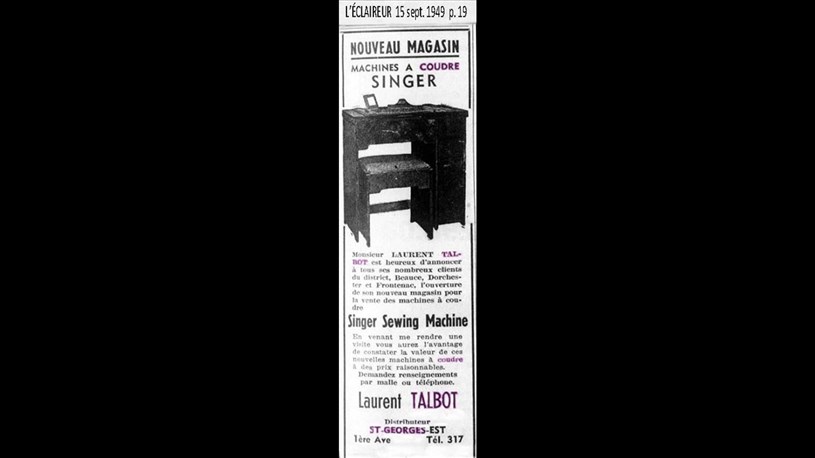 À Saint-Georges, le plus ancien magasin Singer dont nous avons des photos était situé sur la 2e avenue, voisin du restaurant Café Royal (photos 1 et 2, de 1953). Par la suite, il déménagea au 304 de la 1re avenue, pas très loin de la banque de Montréal. Il fut détruit par un incendie dévastateur survenu le 20 novembre 1957, en même temps que quatre autres commerces adjacents. Toutefois, c'est en septembre 1949 que Laurent Talbot ouvrit son premier magasin Singer sur la 1re avenue, au centre-ville (photo 3). Il faisait la vente et la réparations des machines à coudre. À cette époque, les vendeurs faisaient aussi du porte à porte dans les villages voisins pour aller offrir leurs produits directement chez les clientes. Beaucoup de mères de famille cousaient elles-mêmes leurs vêtements et ceux de leurs enfants. Elles avaient donc besoin d'une bonne machine à coudre.
