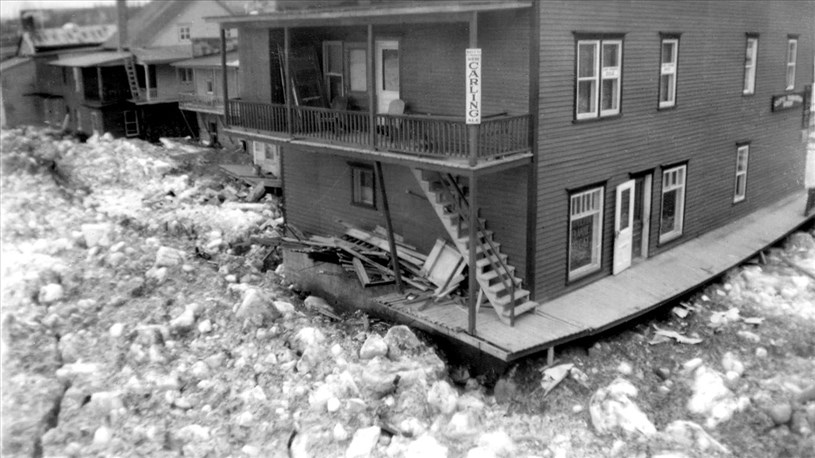 À l'époque c'était considéré comme une importante épicerie, même si le local n'était pas très grand, comparé aux grandes surfaces actuelles. Mais la marchandise était variée et abondante, on y tenait toutes sortes de promotions, par exemple le festival du fromage, comme on le voit dans la vitrine montrée à la photo 6. Ce commerce était très bien situé, en plein centre de la ville, mais devait parfois affronter les calamités de la débâcle, comme le démontre la photo 7 offrant une vue arrière des lieux. Heureusement, le plancher principal était surélevé de quelques marches, mais le sous-sol était inondé de temps en temps.