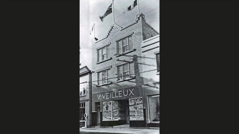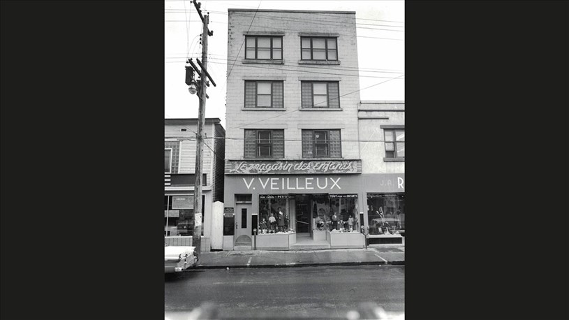 C'est en 1945 que fut fondé le Magasin des enfants sur la première avenue dans le centre commercial de Saint-Georges. C'est un homme d'affaire qui avait auparavant exploité une épicerie, M. Victor Veilleux, qui a démarré ce commerce au rez-de-chaussée d'un immeuble qu'il venait de construire, situé non loin du ruisseau d'Ardoise. La 2e photo (3 étages) date de 1948, pas très longtemps après la construction de cette bâtisse. Comme il y avait beaucoup de demande dans ce secteur, M. Veilleux ajouta un autre étage au début des années '50, le portant à 4 étages (photo 3, vers 1958). Il était situé près de la rivière, voisin du magasin de J.A. Roberge puis de son fils Marc Roberge (photo 4 de 1962). Il y opéra avec succès son magasin de vêtements pour enfants pendant environ 15 ans. Ayant acheté entretemps une industrie dans le domaine du bois (Kennebec Woods), il vendit son commerce de vêtements pour enfants à Mme Marthe Roberge vers 1962. Celle-ci continua les opérations à cet endroit pendant quelque temps, mais les inondations quasi printanières l'ont contrainte à se trouver un nouveau local plus sécuritaire, tout en continuant de bénéficier d'un site tout aussi central.