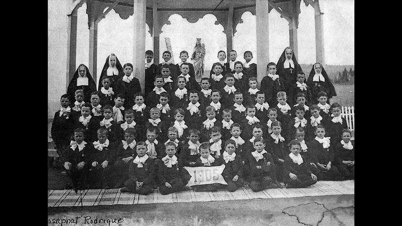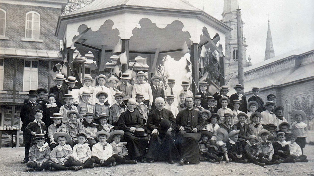 Peu après le feu de 1923, la Supérieure locale d'alors, Soeur Saint-Théodore, a rédigé un récit détaillé décrivant cette terrible nuit du 4 janvier 1923. Elle mentionne entre autres «À 7 heures, il ne reste plus rien du couvent... le kiosque, le pas de géant, tout est disparu...». Or, nous avons à la Société Historique Sartigan deux illustrations exceptionnelles du kiosque dont elle parle. La première photo, rarissime, date des environs de 1915 (photo 1). 57 élèves entourent trois prêtres qui sont assis à l'avant. Et la 2e date de 1905, comme l'indique le panneau tenu par un jeune enfant assis sur la première rangée.